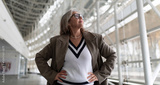Middle-aged Caucasian businesswoman confidently stands in a modern office space with large windows, showcasing her leadership presence