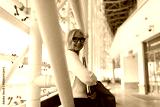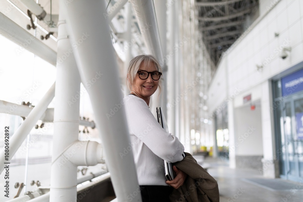 Stylish elderly woman with glasses stands confidently in a modern airport terminal during daytime, smiling at the camera