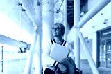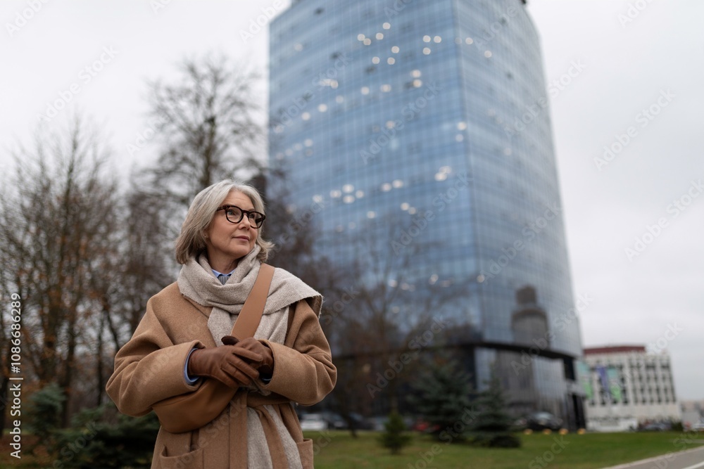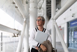 Elderly businesswoman stands confidently in a modern office building, holding a laptop and a blazer while gazing thoughtfully outside