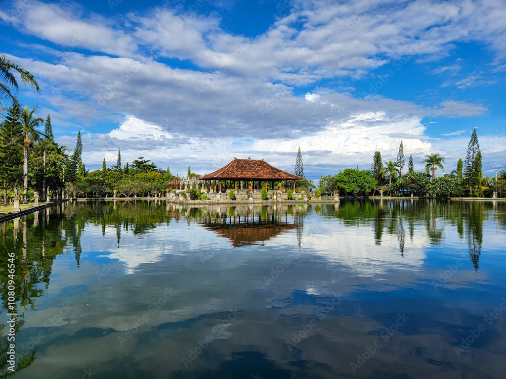 The pavilion at the Taman Ujung Water Palace. Beautiful architecture and the sky are reflected in the water. Bali Island Attraction, Indonesia