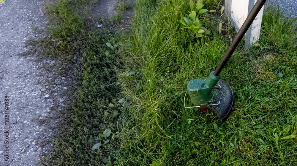A green string trimmer cuts grass along a sidewalk, illustrating lawn care maintenance and weekend gardening routines