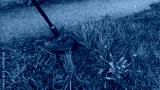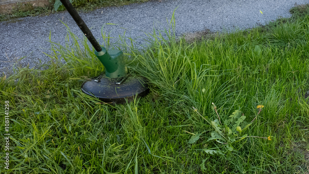 A green lawn trimmer cuts overgrown grass beside a gravel path, illustrating lawn care and summer garden maintenance concepts