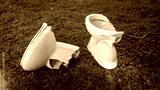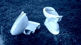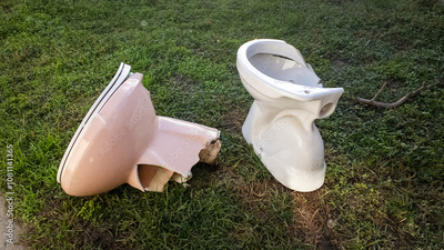 Broken toilet pieces on grass symbolize household renovation challenges, highlighting environmental waste issues and sustainable living concepts