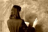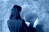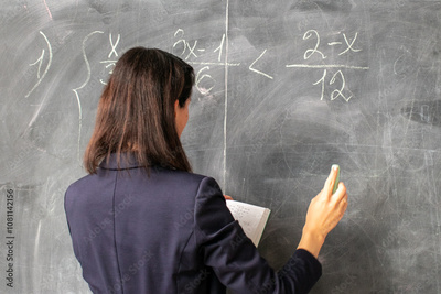 A female teacher of Asian descent writes math equations on a chalkboard, illustrating a problem-solving concept in education