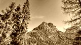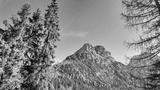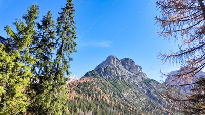 Majestic mountain landscape with evergreen trees under a clear blue sky, capturing the essence of summer outdoor adventures