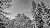 Majestic Dolomite mountain landscape with vibrant evergreen trees under a clear blue sky, ideal for adventure and Earth Day themes