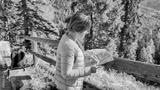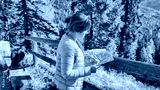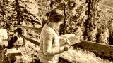 A Caucasian woman reads a map while hiking in a scenic autumn forest, symbolizing exploration and adventure travel