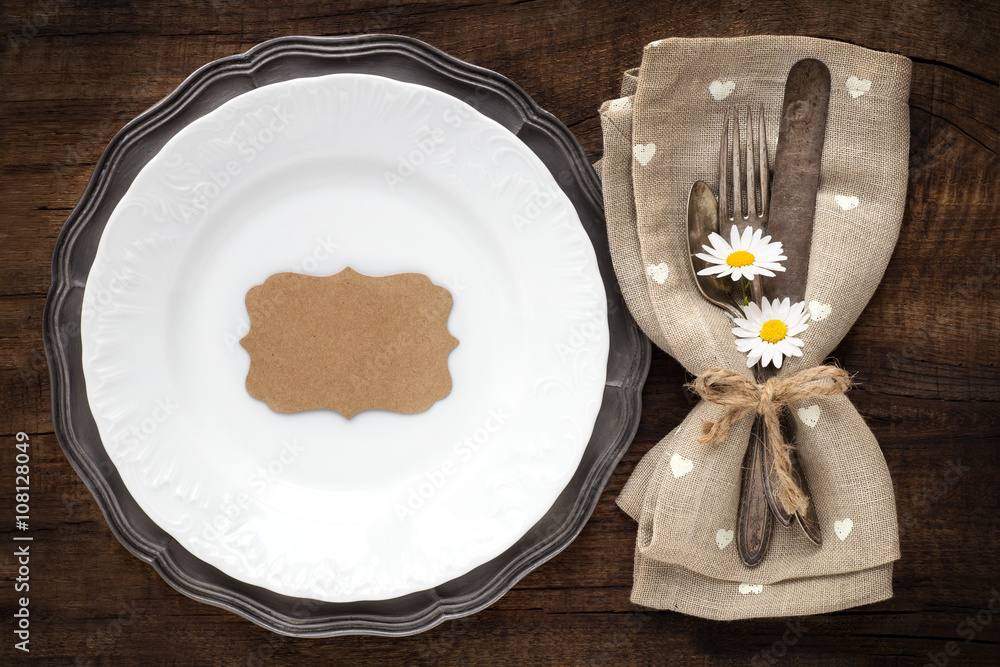 Table place setting with vintage silverware and plate with an empty tag for your text on rustic wooden background