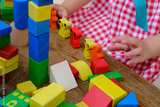 girl plays role-playing games with wooden figurines, figures, blocks, kindergarten games, concept of childhood, earlier child development, creativity, early training