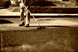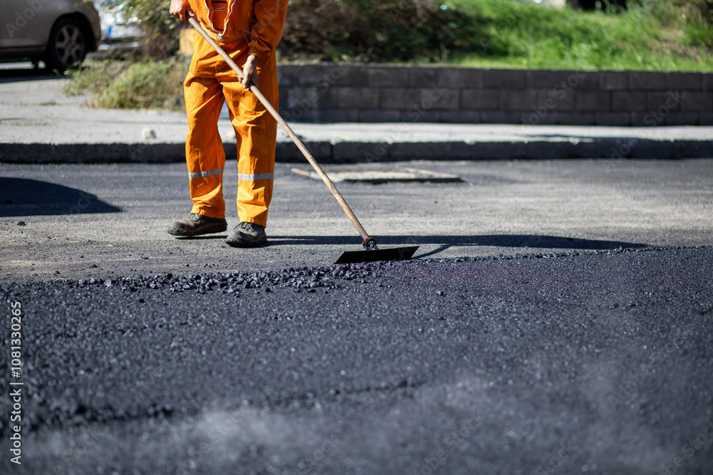 Road worker applying fresh asphalt on a sunny day in a city street, focusing on surface repair and maintenance efforts
