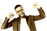 Happy young arabian or caucasian man in glasses celebrating with raised fists, showing excitement and enthusiasm, dressed in a red shirt, standing on isolated white background