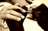 Manicure service. Close-up. Application of light varnish . The manicurist paints her nails with a transparent gel polish. Well-groomed nails. Professional salon hand care.