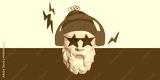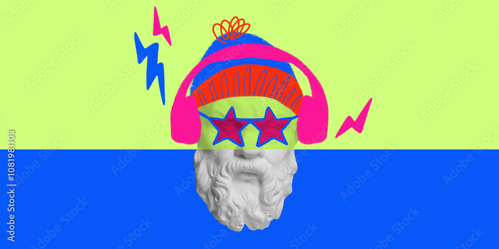 Antique statue bust adorned with red star-shaped glasses and headphones on neon green and blue split background, funky pop art style. Contemporary art collage. Concept of modern art, creativity