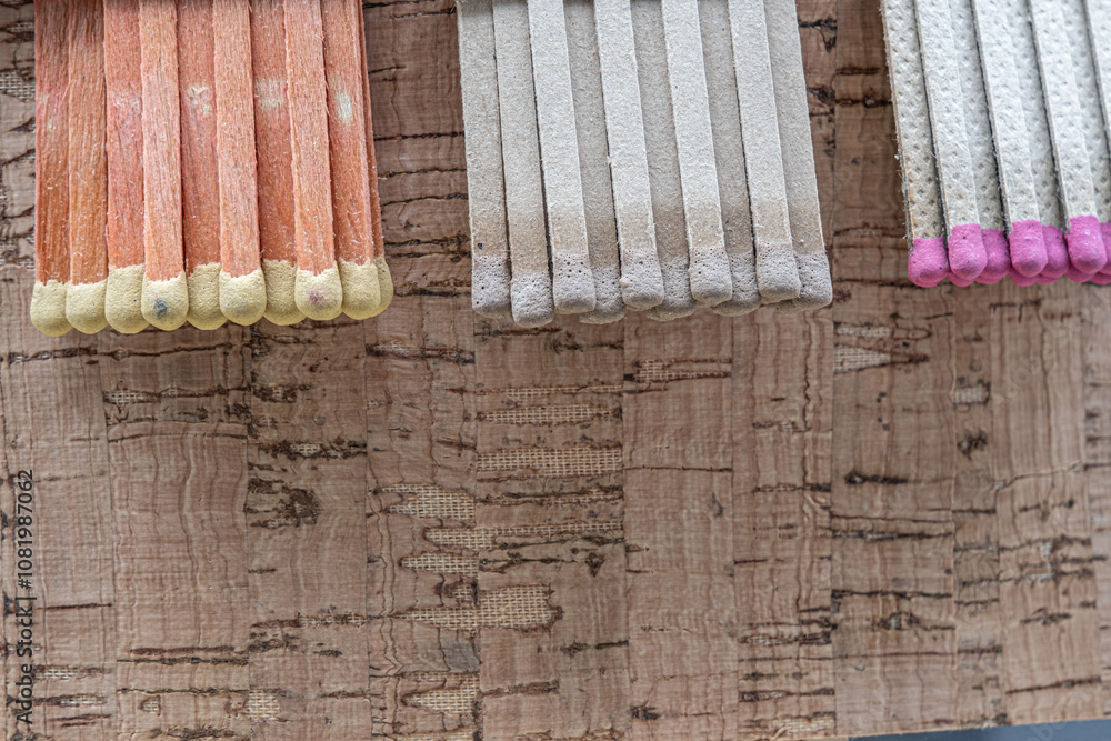 matchsticks of various shapes and colors with Texture of cork board wood surface on background