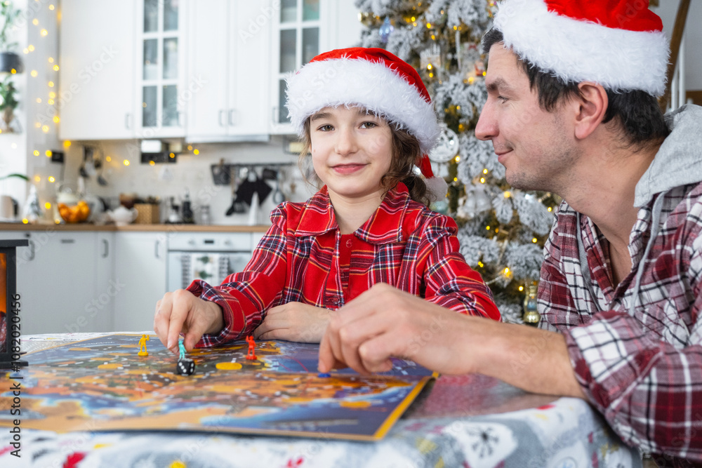 Happy family of dad and daughter in festive Santa hats Playing board game at table in a white kitchen with a Christmas tree and decor. New Year, family values.