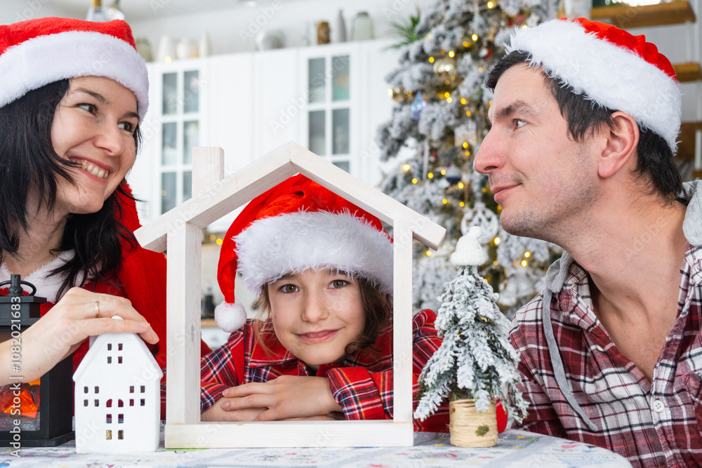 Happy family in santa hats with tiny house in cozy home with Christmas decor of festive white kitchen. Gift for New Year. Insurance, moving to new house, mortgage, rent and purchase real estate