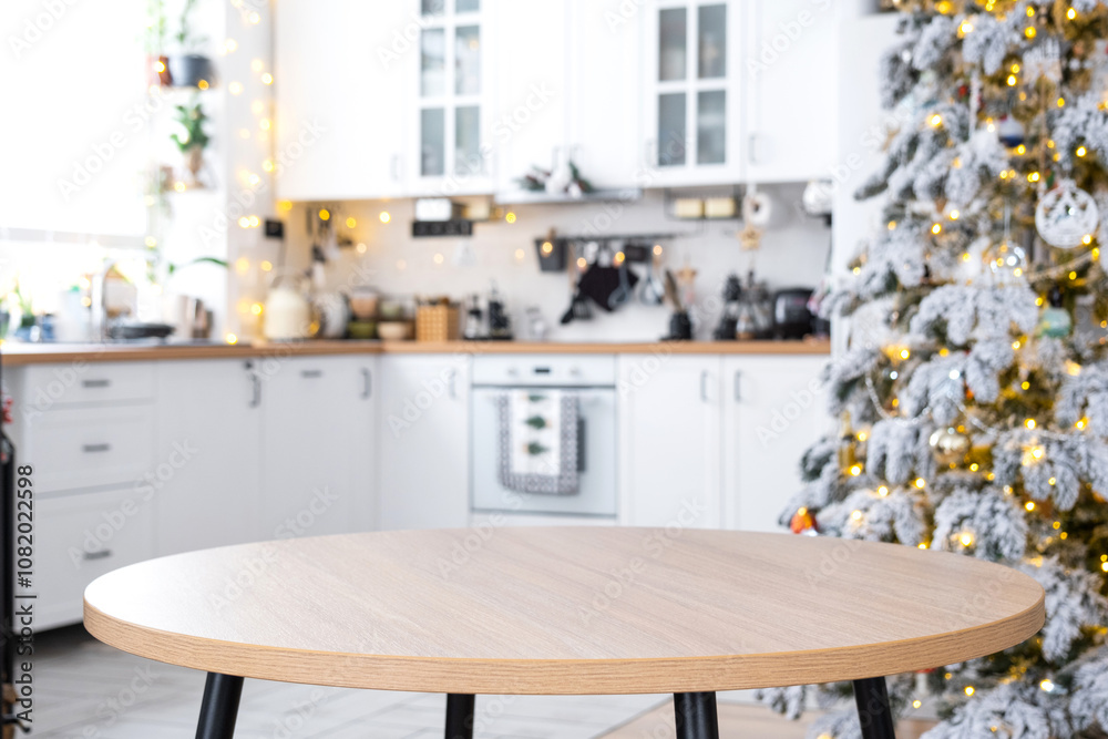 Round empty table to demonstrate the product with space for text in white kitchen, modern interior with a Christmas tree and fairy lights. New Year, Christmas mood, cozy home.