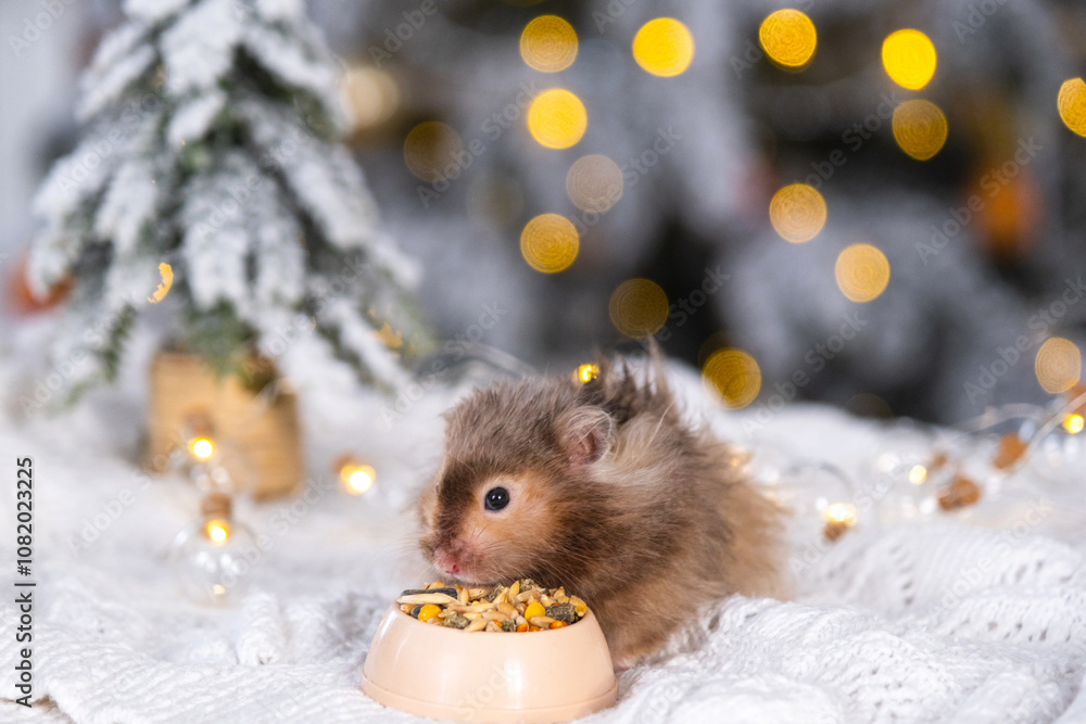 A funny shaggy fluffy hamster nibbles feed seeds from a bowl on a Christmas background with fairy lights and bokeh
