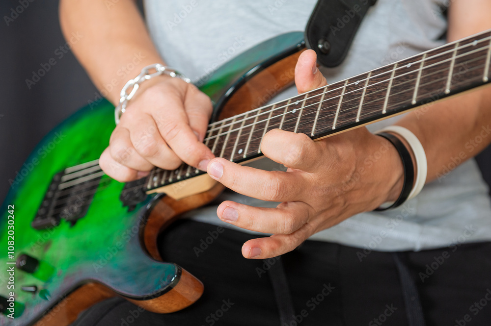 Musician hands skillfully playing electric guitar strings