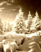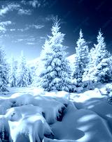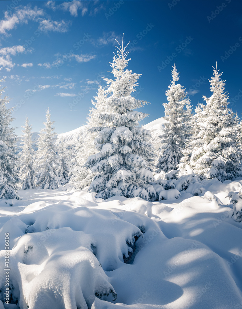 Vivid and fantastic snowy conifers covered with hoarfrost on a frosty day.