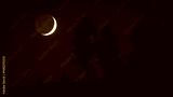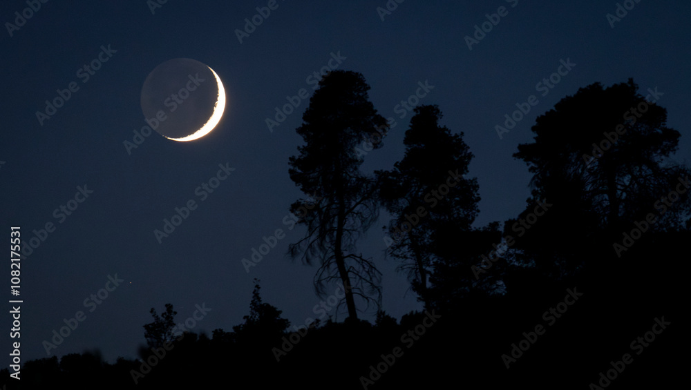 A crescent moon illuminates the night sky, casting a serene glow above a group of silhouetted trees, creating a tranquil and picturesque evening scene.