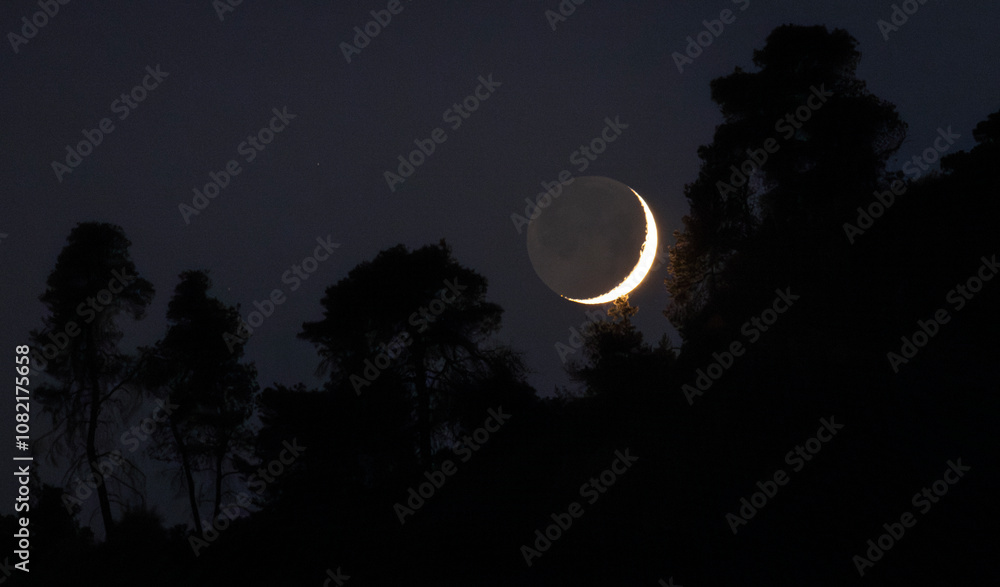 A crescent moon illuminates the night sky, casting a serene glow above a group of silhouetted trees, creating a tranquil and picturesque evening scene.