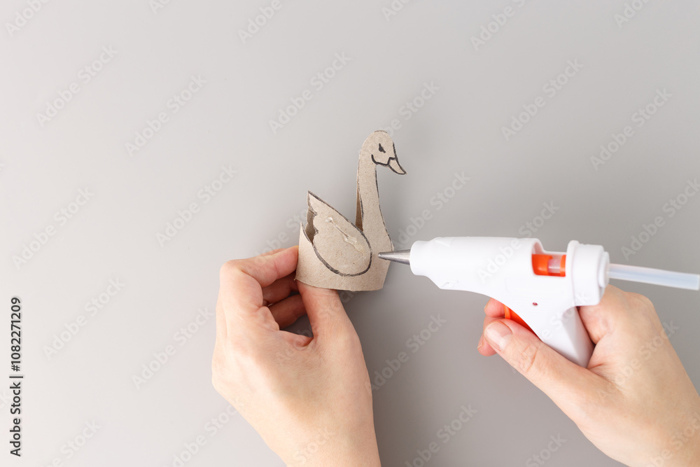step in creative process of handmade swan figurine using cardboard and pampas grass, DIY craft on grey background , upcycled art, creative natural design for home decor projects, using hot glue gun ,