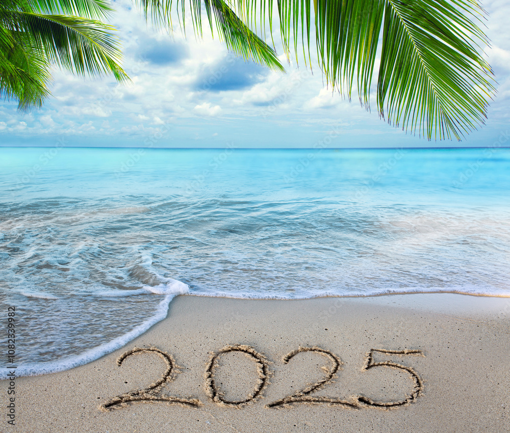 New Year 2025 background with Santa hat and hand written in the white sand.
