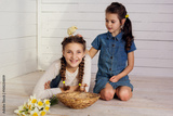 Pretty girls are playing with baby chicks in studio