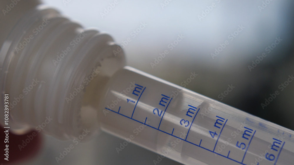 Close up of measuring antibiotics dosage with a transparent syringe