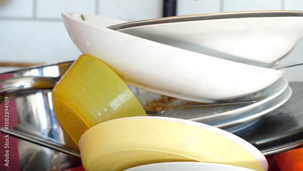 Close up view of a sink full of dirty dishes, cluttered home kitchen