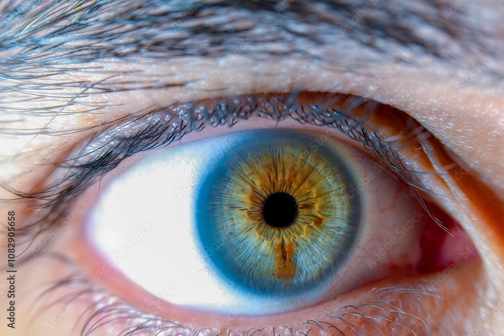 Macro shot of a human eye with a stunning blue iris and brown patches, featuring detailed textures and visible eyebrows and eyelashes. The natural beauty of the eye is highlighted in high resolution