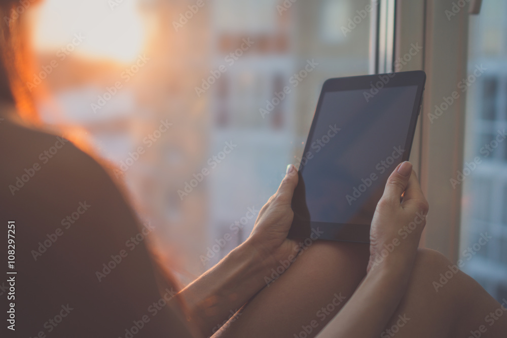 woman sitting next to window using tablet, reading