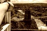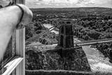 Widok przez okno na most wiszący nad rzeką Avon w zachodniej Anglii.