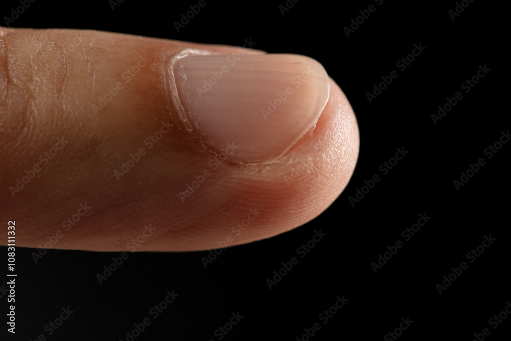 Clean normal long fingernail without color or coating on nail. Long clean fingernail to show texture detail of uneven nail and scratch skin, black background isolated