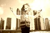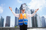 Engineer or worker wearing virtual reality glasses(VR) at urban industrial site