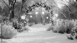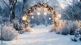Beautiful winter wedding arch decorated with flowers and lanterns in a serene snowy landscape, creating a magical and romantic atmosphere for ceremonies