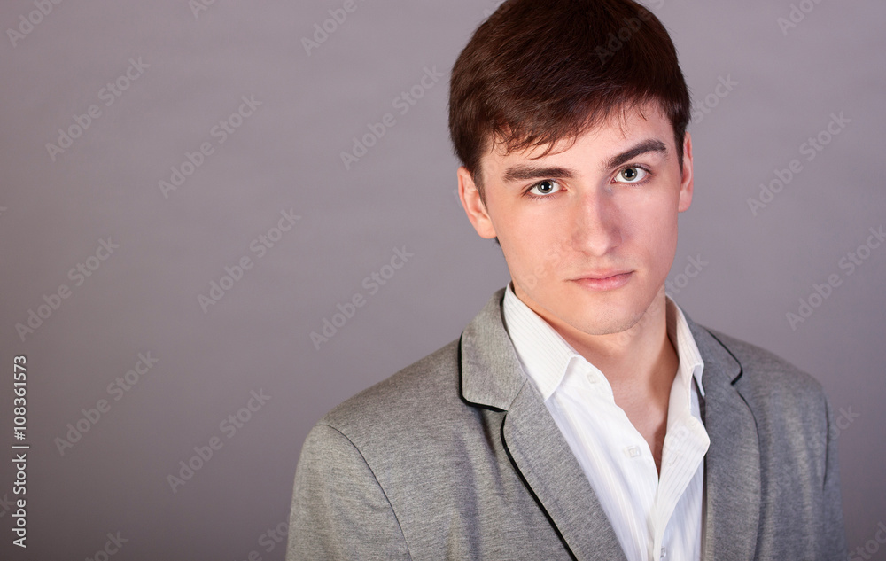 The young man, a businessman, jacket and shirt fashion style, youth direction, concept idea business man gray background
