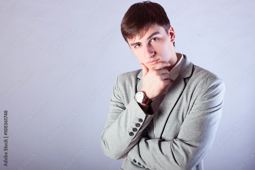 The young man, a businessman, jacket and shirt fashion style, youth direction, concept idea business man gray background
