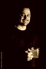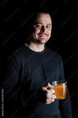 Smiling Man Holding a Glass of Tea Against a Dark Background