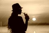Closeup portrait of woman in hat with cocktail at tropical sunset