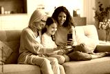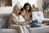 Three beautiful women, different generations relatives spend carefree leisure together at home using smartphone, make videocall or selfie pictures, watch videos. Family, connection, modern tech usage