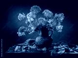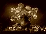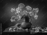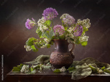 Still life with a bouquet of blooming hawthorn and ornamental onions in a clay jug on a dark background