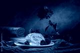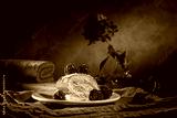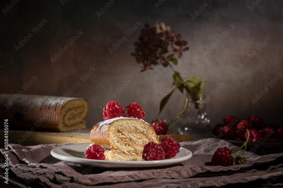 Roll with fresh raspberries on a dark background