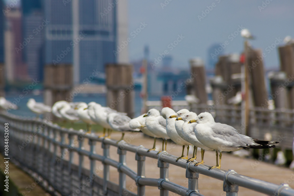 A group of seagulls is perched on a railing along a waterfront. The city skyline rises in the background under a clear blue sky, showcasing a vibrant summer atmosphere.