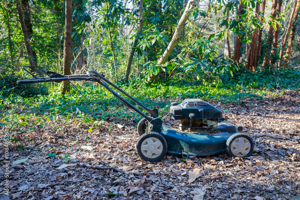 The lawn mower sits idle on a forested path, surrounded by greenery and fallen leaves. Sunlight filters through the trees, creating a peaceful atmosphere.
