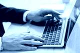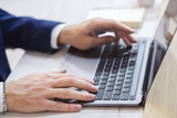 Against a softly blurred office scene, a man's hands are shown in detail, typing on a state-of-the-art laptop keyboard