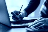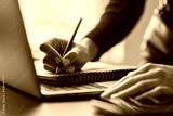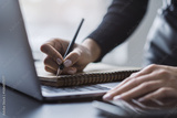 Close perspective of a woman's hand scribbling in a notepad on a stylish laptop, with a soft blur in the surroundings