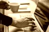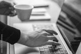 Picture focuses on a woman's hands typing on a contemporary laptop keyboard, office setting appearing blurred