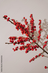 Branch with Red Berries Casting Shadows. Nature-Inspired, Autumn to Winter Transition, Christmas Accent, Organic Design, Festive Foliage